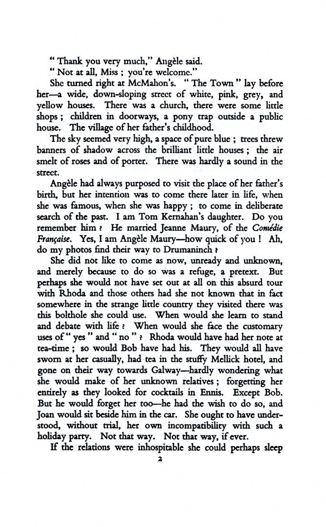 It is 1939, the last summer before the outbreak of war. French actress Angele Maury abandons a group of friends travelling through Ireland and takes herself to picturesque Drumaninch, birthplace of her dead father. She has come to make sense of her past. Self-conscious with her pale, exotic beauty, Angele braves the idiosyncratic world of the Kernahans: her enigmatic aunt Hannah, her ridiculous but loveable uncle Corney and her three cousins – Martin, charming, intense; Tom, devoted to his mother, and their bright sister Jo, who combines religious faith with a penchant for gambling.