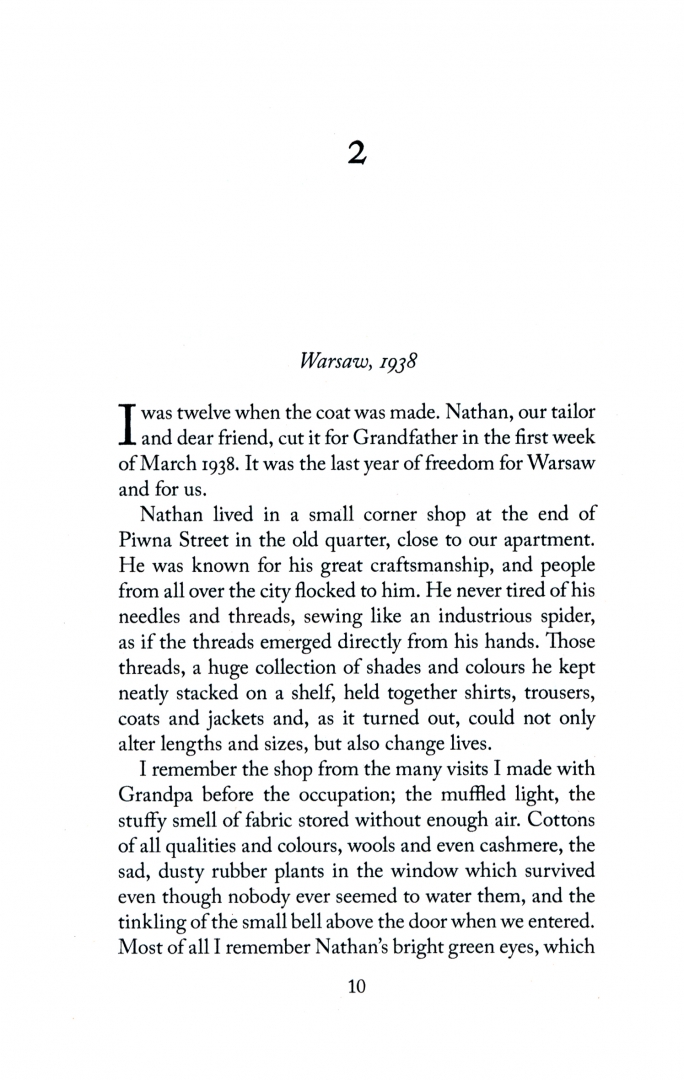 I was twelve when the coat was made. Nathan, our tailor and dear friend, cut it for Grandfather in the first week of March 1938. It was the last week of freedom for Warsaw and for us...