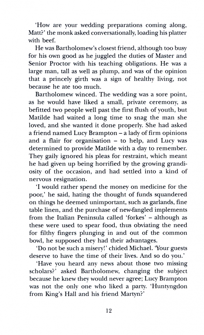 In 1360, the Great Bridge over the River Cam is close to collapse. To repair it will cost the town and the University dear, especially if its rotten wood is replaced by more durable stone. As arguments rage over raising the money other, equally heated, differences are coming to the boil over the election of a new Chancellor. While the majority support Brother Michael for the post, at least one of his opponents aims to seize it by fair means or foul. Then the discovery of a body under the bridge and the disappearance of two scholars throws a more sinister shadow over both disputes.