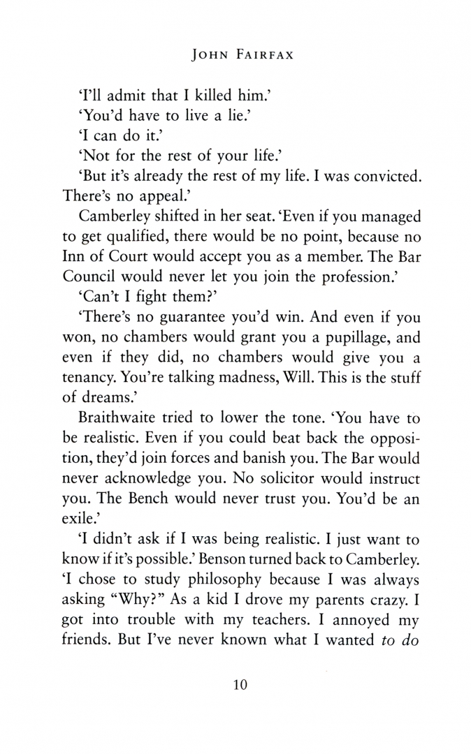 Sixteen years later Tess overhears a couple of hacks mocking a newcomer to the London Bar, a no-hoper with a murder conviction, running his own show from an old fishmonger's in Spitalfields. That night she walks back into Benson's life. The price of his rehabilitation - and access to the Bar - is an admission of guilt to the killing of Paul Harbeton, whose family have vowed revenge. He's an outcast. The government wants to shut him down and no solicitor will instruct him. But he's subsidised by a mystery benefactor and a desperate woman has turned to him for help: Sarah Collingstone, mother of a child with special needs, accused of slaying her wealthy lover. It's a hopeless case and the murder trial, Benson's first, starts in four days. The evidence is overwhelming but like Benson long ago, she swears she's innocent. Tess joins the defence team, determined to help Benson survive. But as Benson follows the twists and turns in the courtroom, Tess embarks upon a secret investigation of her own, determined to uncover the truth behind the death of Paul Harbeton on a lonely night in Soho.