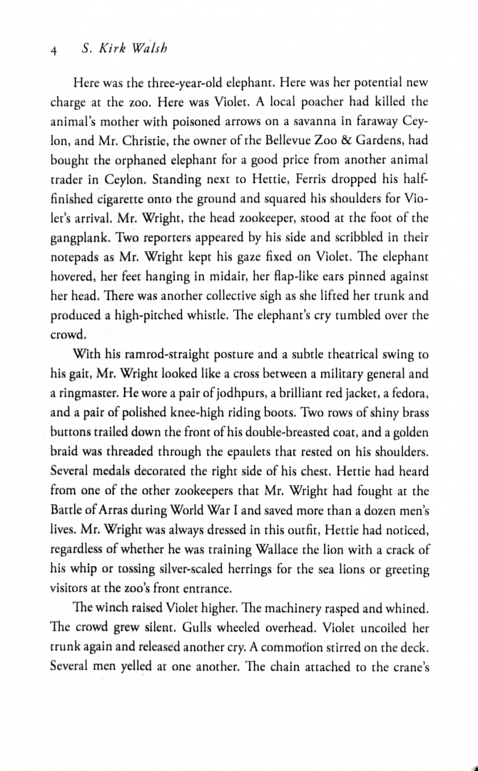 1941. With the men away fighting, animal-lover Hettie Quin is made Belfast Zoo's first ever female zookeeper. She is put in charge of Violet, a three-year-old Indian elephant, and they soon form a special bond. With Violet at her side, Hettie can almost escape the grim reality of her life: the father who has abandoned her family; the sister who recently died; the war that's raging hundreds of miles away.