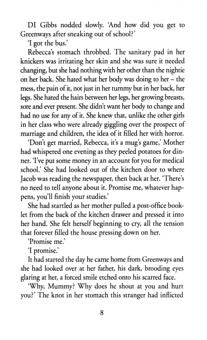 1960. Thirteen-year-old Rebecca lives in fear of her father's temper. As a storm batters Seaview Cottage one night, she hears a visitor at the door and a violent argument ensues. By the time the police arrive, Rebecca's parents are dead and the visitor has fled. No one believes Rebecca heard a stranger downstairs...