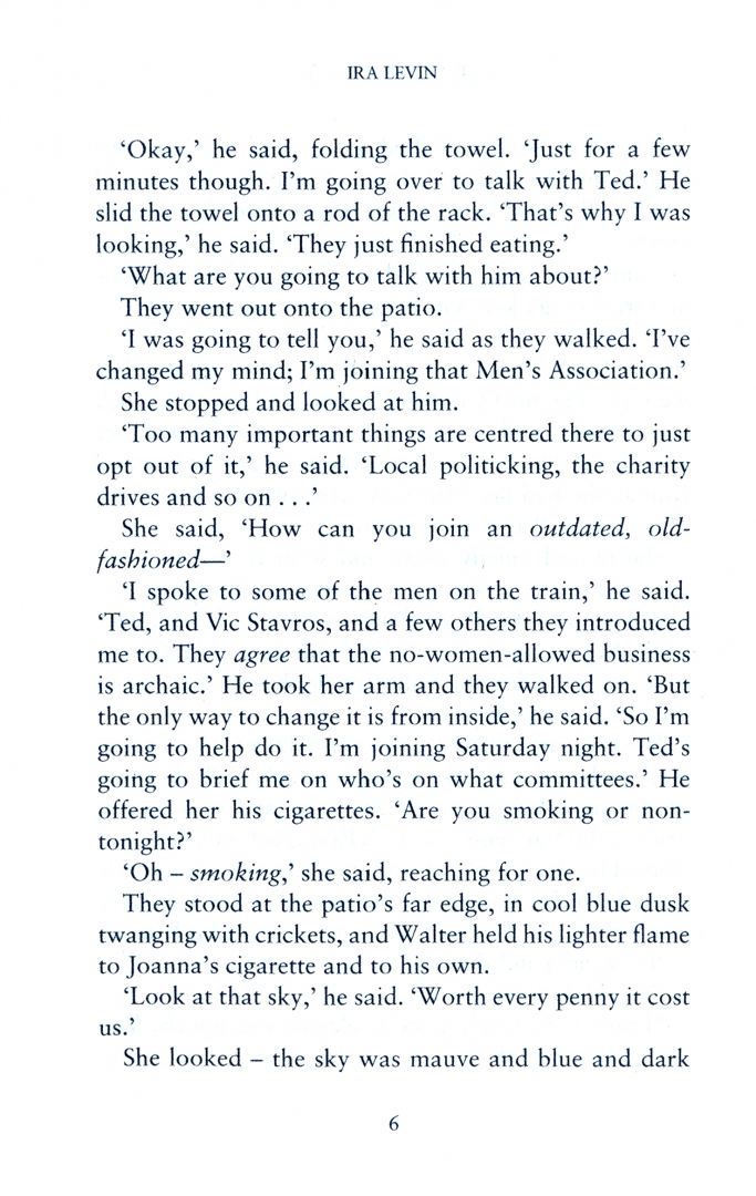 But just beneath the town's flawless surface, something is sordid and wrong - something abominable with roots in the local Men's Association. And it may already be too late for Joanna to save herself from being devoured by Stepford's hideous perfection.