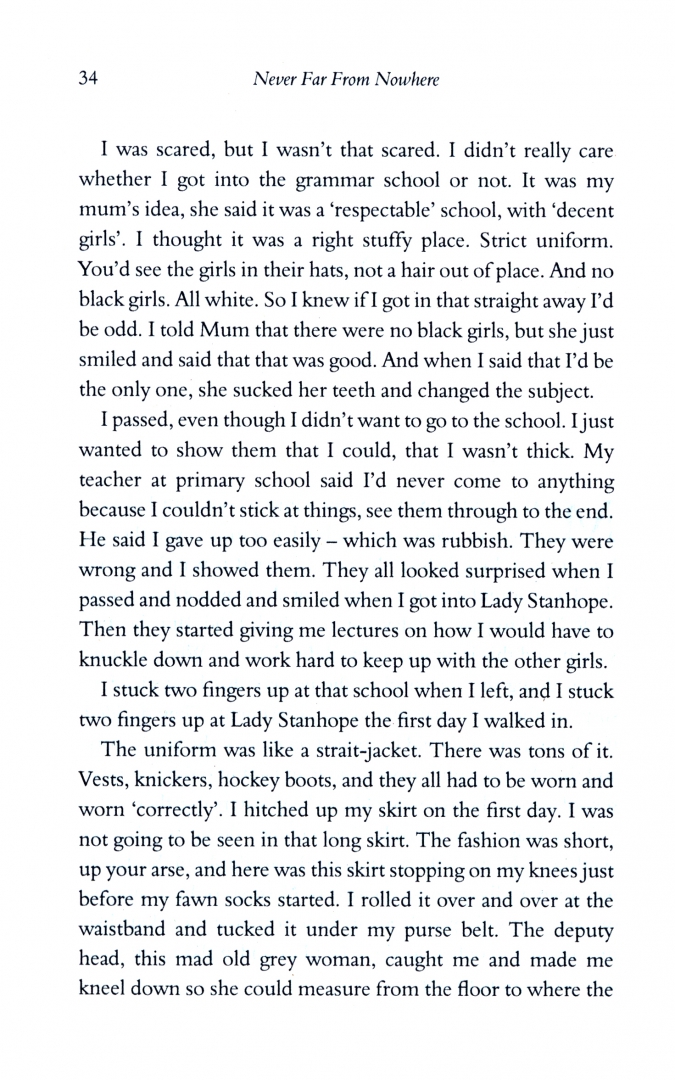 Never Far From Nowhere is the story of two sisters, Olive and Vivien, born in London to Jamaican parents and brought up on a council estate. They go to the same grammar school, but while Vivien s life becomes a chaotic mix of friendships, youth clubs, skinhead violence, A-levels, discos and college, Olive, three years older and a skin shade darker, has a very different tale to tell...