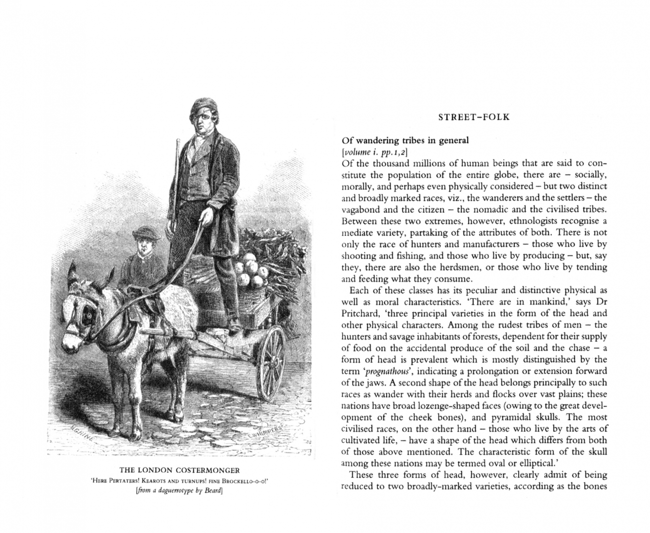No previous writer had succeeded in presenting the poor through their own stories and in their own words, and in this undertaking Mayhew rivals his contemporary Dickens. 'To pass from one to the other', writes one authority,' is to cross sides of the same street'.