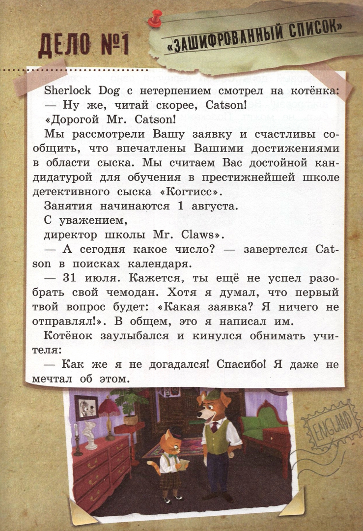Думаешь, что только ты мечтаешь о каникулах? А вот и нет! Мы тоже считаем, что пора отдохнуть! Кстати, знаменитый детектив Sherlock Dog и его любопытный ученик Catson продолжают изучать английский язык и готовы помочь в этом и тебе. В их жизни все поменялось! Catson прошел отбор в закрытую школу детективного сыска "Когтисс". Вот только она не зря "закрытая": в школе постоянно происходят таинственные исчезновения! То прямо из дневника пропало расписание, то ценную книгу украли, а то и вовсе Рождество оказалось в опасности! Хочешь стать настоящим экспертом в области детективного сыска и английского языка? Тогда смелее: наши герои уже ждут тебя, приключение начинается! А специальные коды на страницах книги помогут и твоим родителям принять участие в расследовании.