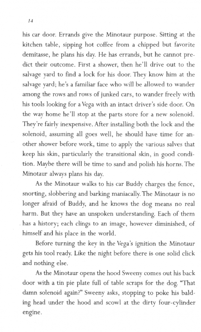 Five thousand years after leaving the Cretan Labyrinth, the Minotaur – or M as he is known to his colleagues – is working as a line chef at Grub’s Rib in Carolina, keeping his horns down, trying in vain to put his past behind him. He leads an ordered lifestyle in a shabby trailer park where he tinkers with cars, writes and re-writes to-do lists and observes the haphazard goings on around him. Outwardly controlled, M tries to hide his emotional turmoil as he is transported deeper into the human world of deceit, confusion and need.