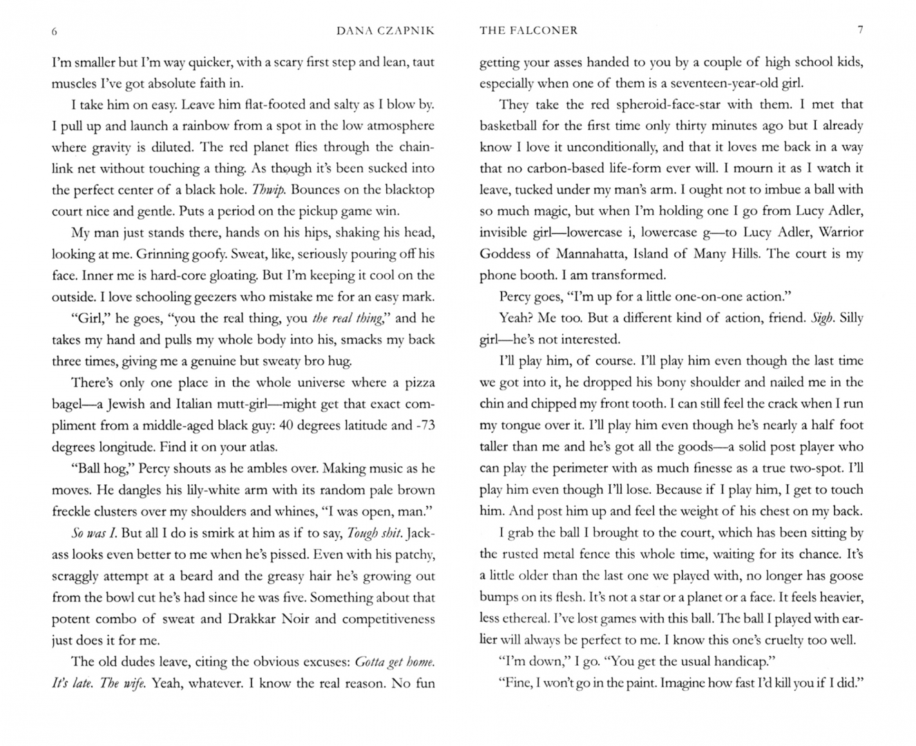 Seventeen-year-old Lucy Adler, a street-smart, trash-talking baller, is often the only girl on the public courts. Lucy’s inner life is a contradiction. She’s by turns quixotic and cynical, insecure and self-possessed and, despite herself, is in unrequited love with her best friend and pick-up teammate Percy, son of a prominent New York family who is trying to resist his upper crust fate.
