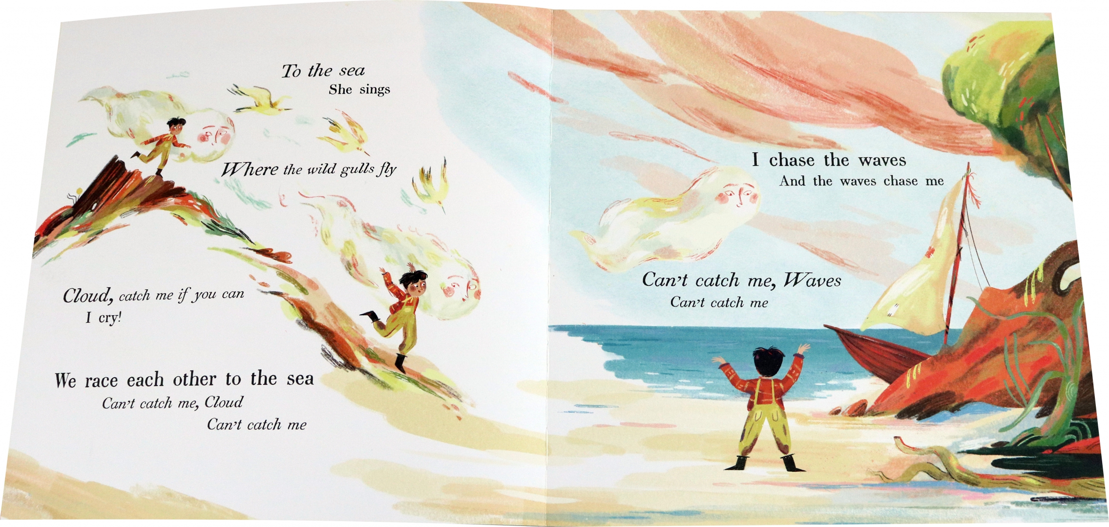 A boy and a dog follow a cloud out to sea, but as the weather worsens he relies on the whales and waves to bear him home.