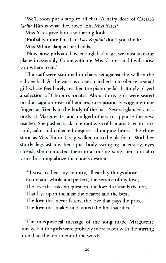 It is 1948 and the young and beautiful Marguerite Carter has lost her parents and survived a terrifying war, working for the SOE behind enemy lines. She returns to England to be one of the first women to receive a degree from the University of Cambridge. Now she pins back her unruly auburn curls, draws a pencil seam up her legs, ties the laces on her sensible black shoes, and sets out towards her future as an English teacher in a girls' grammar school. Outside the classroom Britain is changing fast, and Miss Carter finds herself caught up in social upheaval, swept in and out of love and forging deep, enduring friendships.