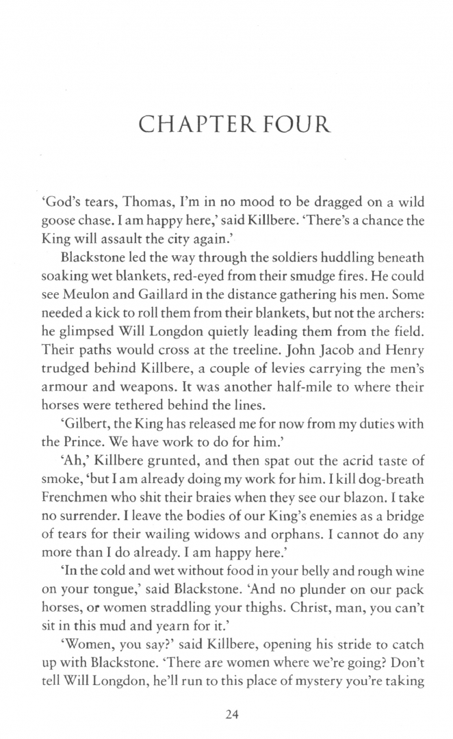 Mired down in costly sieges and facing a stalemate, Edward's great army is forced to argee a treaty. But peace comes at a price. The French request that Blackstone escort their King's daughter to Italy to see her married to one of the two brothers who rule Milan – the same brothers who killed Blackstone's family to revenge the defeats they suffered at his hand.