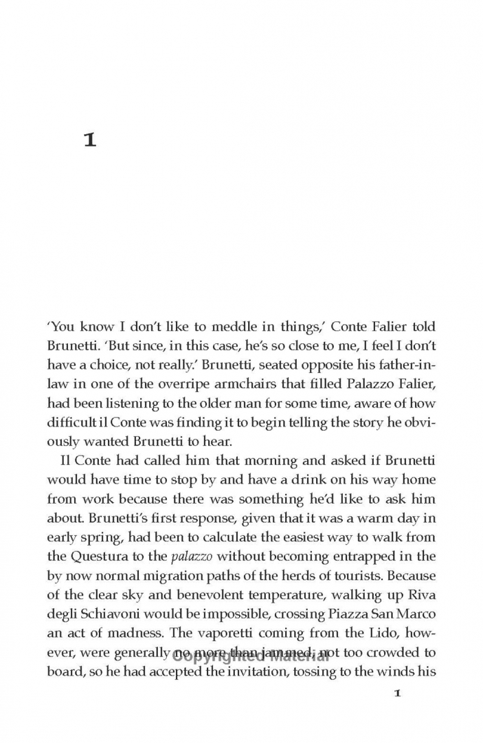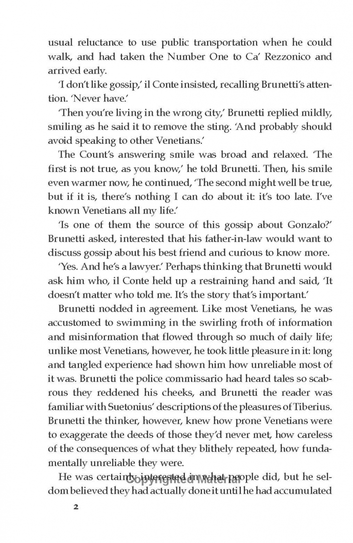 Not long after Brunetti and Gonzalo meet, Gonzalo passes away. Old and frail, his death goes unquestioned, until one of his closest confidantes is strangled in her hotel room after sending an email about the adoption. To find the killer and solve a murder most foul, Brunetti must rely on his instincts which lead him to untangling long-buried secrets from Gonzalo's past.