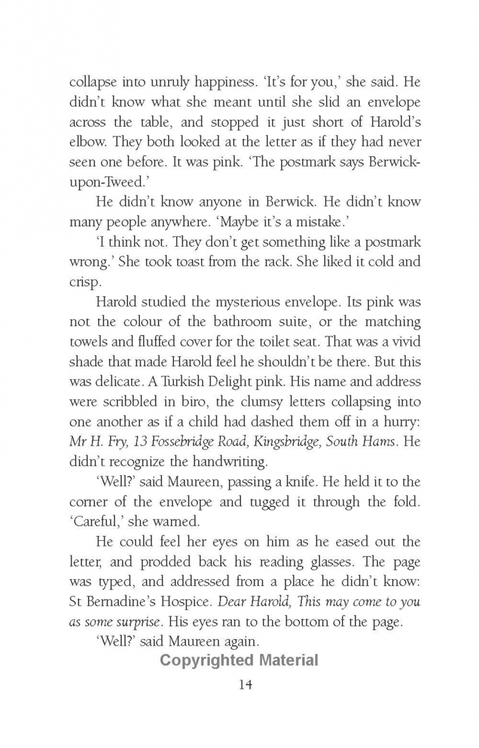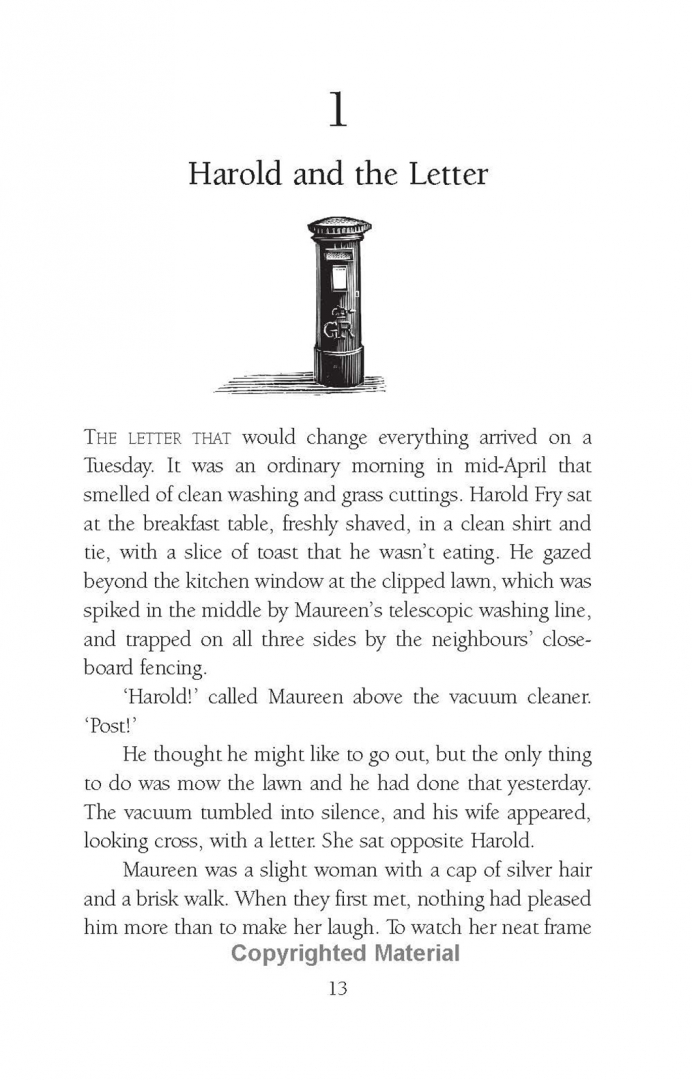 Harold is an ordinary man who has passed through life, living on the side lines, until he goes to post a letter one day...and just keeps walking.
