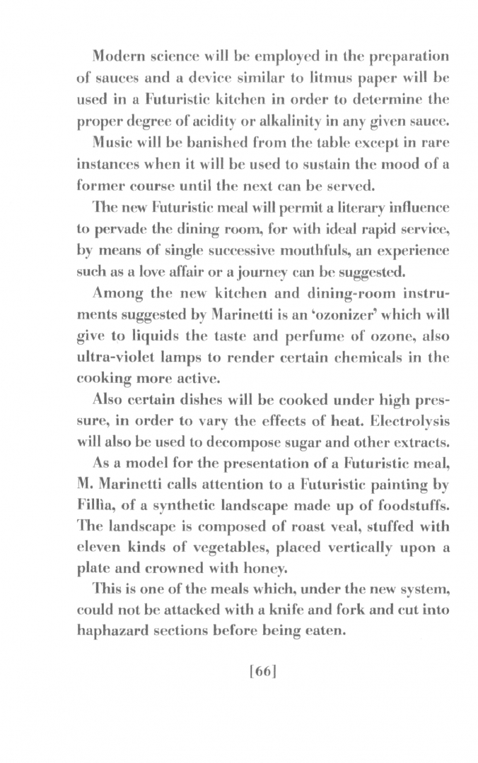 Part manifesto, part artistic joke, Fillippo Marinetti's Futurist Cookbook is a provocative work about art disguised as an easy-to-read cookbook. Here are recipes for ice cream on the moon; candied atmospheric electricities; nocturnal love feasts; sculpted meats. Marinetti also sets out his argument for abolishing pasta as ill-suited to modernity, and advocates a style of cuisine that will increase creativity. Although at times betraying its author's nationalistic sympathies, The Futurist Cookbook is funny, provocative, whimsical, disdainful of sluggish traditions and delighted by the velocity and promise of modernity.