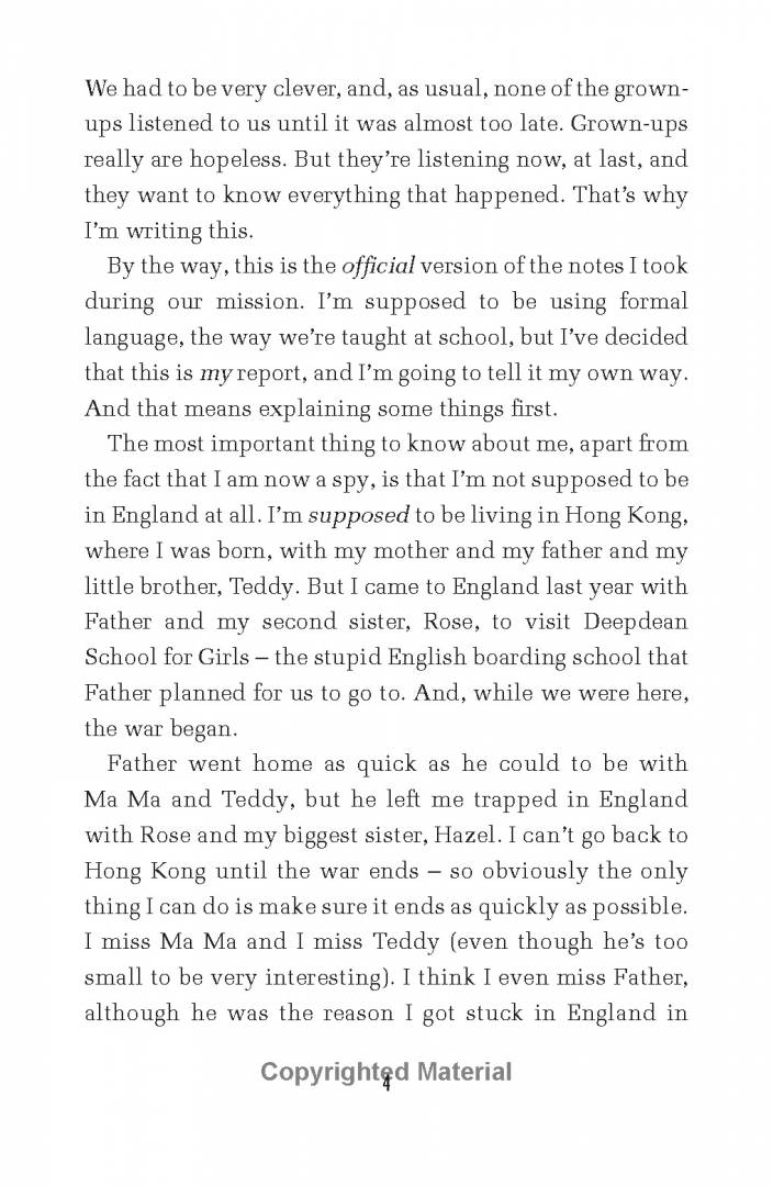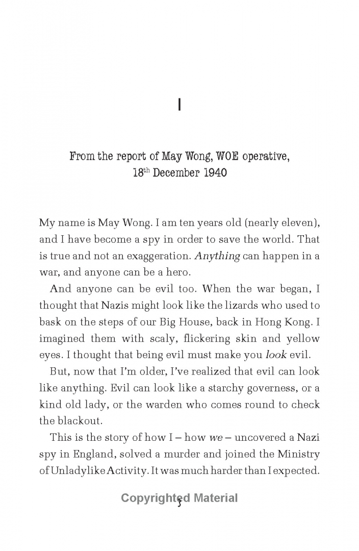 Enter May Wong: courageous, stubborn, and desperate to help end the war so that she can go home to Hong Kong (and leave her annoying school, Deepdean, behind forever). May knows that she would make the perfect spy. After all, grown-ups always underestimate children like her.