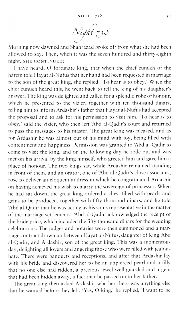 Every night for three years the vengeful King Shahriyar sleeps with a different virgin, executing her next morning. To end this brutal pattern and to save her own life, the vizier's daughter, Shahrazad, begins to tell the king tales of adventure, love, riches and wonder - tales of mystical lands peopled with princes and hunchbacks, the Angel of Death and magical spirits, tales of the voyages of Sindbad, of Ali Baba's outwitting a band of forty thieves and of jinnis trapped in rings and in lamps. The sequence of stories will last 1,001 nights.