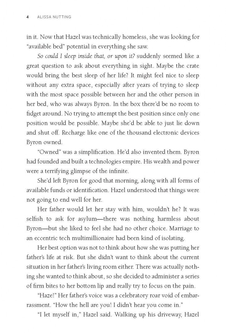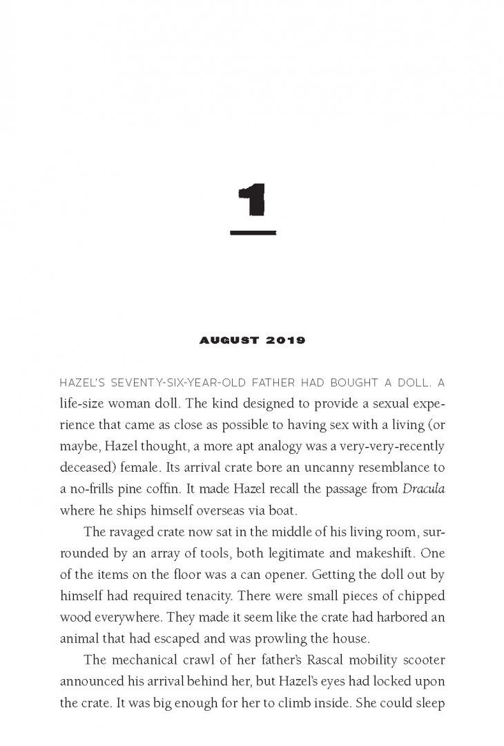 Hazel has just moved into a trailer park of senior citizens, with her father and Diane - his sex doll companion. Life with Hazel's father is strained at best, but it's got to be better than her marriage to dominating tech billionaire, Byron Gogol. For over a decade, Hazel has been quarantining in Byron's family compound, her every movement and vital sign tracked. So when Byron demands to wirelessly connect the two of them via brain chips, turning Hazel into a human guinea pig, Hazel makes a run for it. Will Hazel be able to free herself from Byron's virtual clutches before he finds her?
