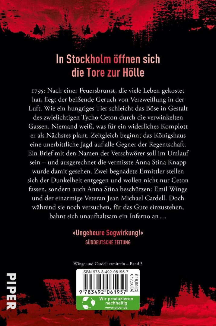 Zeitgleich beginnt das Königshaus eine unerbittliche Jagd auf alle Gegner der Regentschaft. Ein Brief mit den Namen der Verschwörer soll im Umlauf sein – und ausgerechnet die vermisste Anna Stina Knapp wurde damit gesehen. Zwei begnadete Ermittler stellen sich der Dunkelheit entgegen und wollen nicht nur Ceton fassen, sondern auch Anna Stina beschützen: Emil Winge und der einarmige Veteran Jean Michael Cardell. Doch während sie noch versuchen, für das Gute einzustehen, bahnt sich unaufhaltsam ein Inferno an …