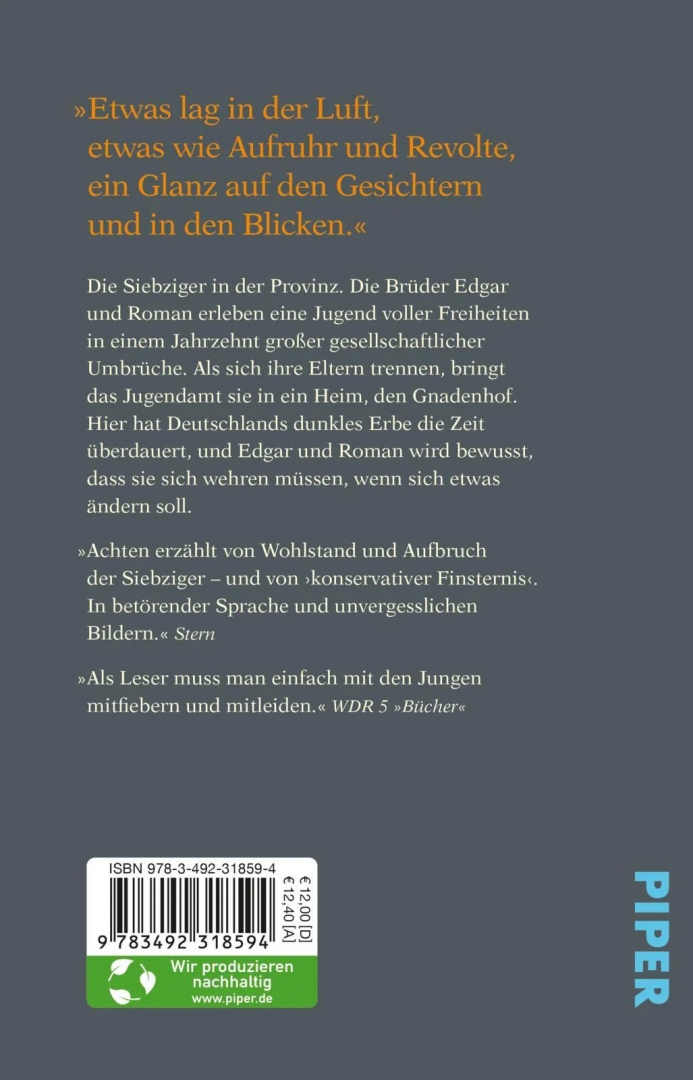 In glühenden Bildern erzählt Willi Achten von einem spannungsvollen Jahrzehnt, dem unauflösbaren Band zwischen Geschwistern und vom Aufbruch einer Generation, die dem dunklen Erbe ihrer Eltern mit aller Entschiedenheit entgegentritt.