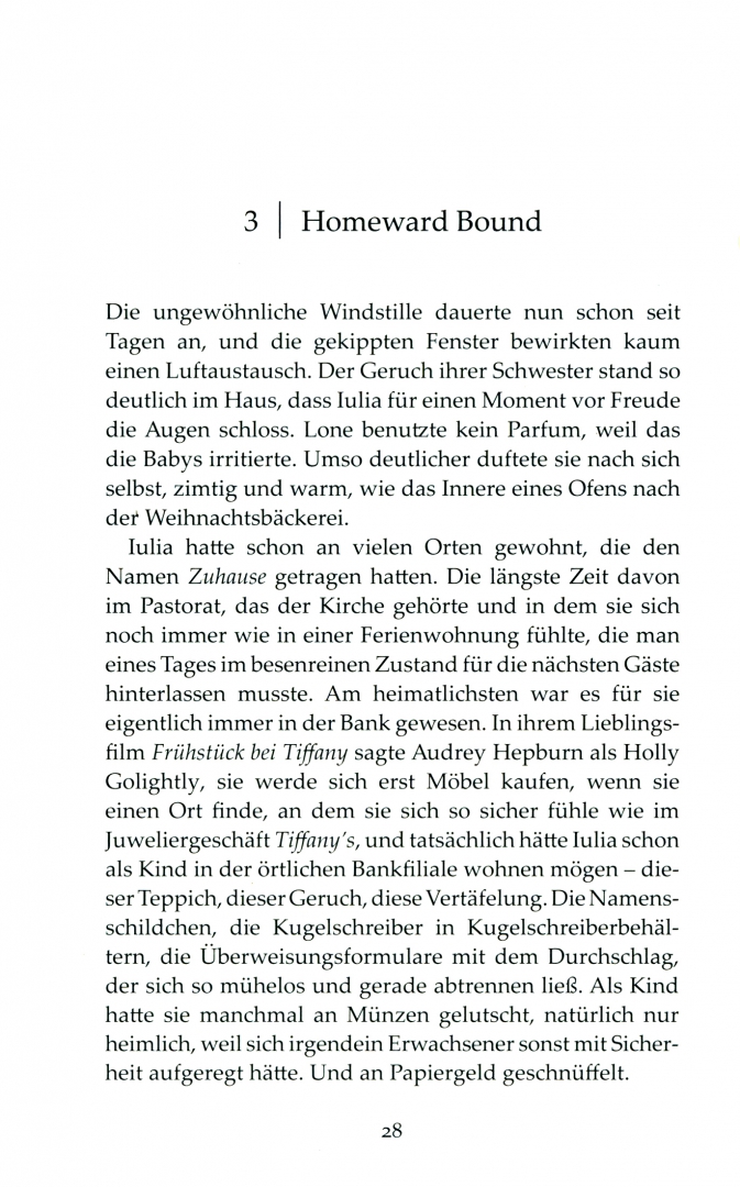 Iulia lässt sich aufs Sofa ihrer Schwester fallen. Sie hat nicht allzu oft darauf gesessen, viel zu selten eigentlich. Wo ist sie in letzter Zeit gewesen, warum haben Lone und sie sich nicht viel öfter getroffen? - Die Antworten auf diese Fragen muss sie allein finden. Lone liegt nach einem Unfall im Koma, und Iulia ist gezwungen, einige ihrer Aufgaben als Hebamme zu übernehmen. Sie beginnt nachzudenken, über ihre Familie und die Männer, über Vertrauen und die gemeinsamen Erlebnisse - nicht zuletzt auch über das Leben, das sie selbst seit Jahren führt: als Frau des Pastors und Angestellte in einer Sparkasse.