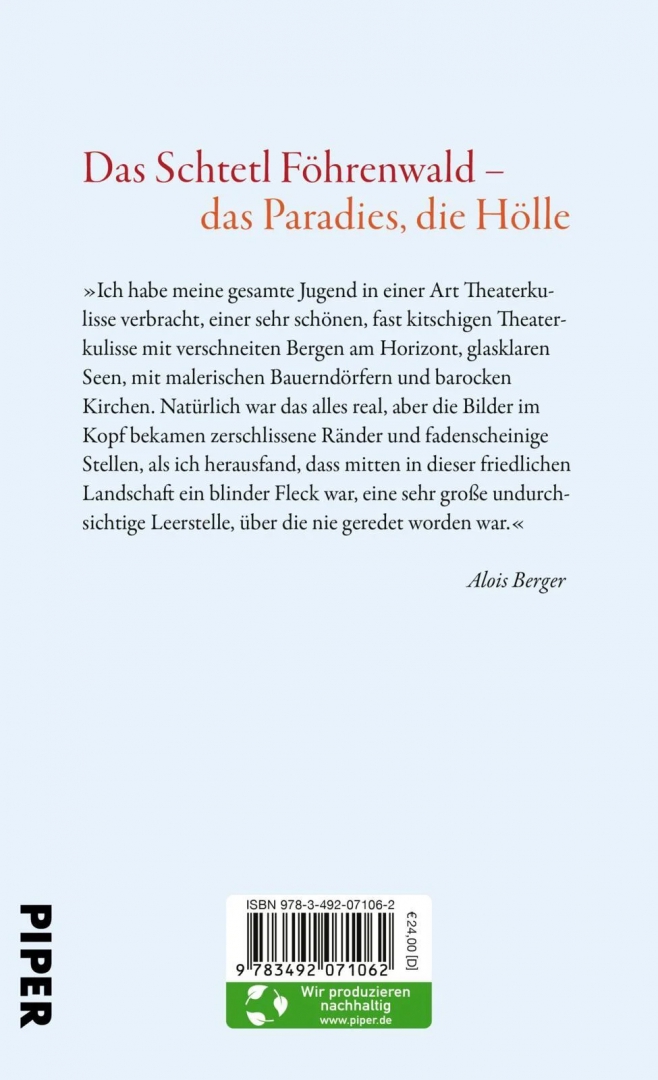 „Ich habe meine gesamte Jugend in einer Art Theaterkulisse verbracht, einer sehr schönen, fast kitschigen Theaterkulisse mit verschneiten Bergen am Horizont, glasklaren Seen, mit malerischen Bauerndörfern und barocken Kirchen. Natürlich war das alles real, aber die Bilder im Kopf bekamen zerschlissene Ränder und fadenscheinige Stellen, als ich herausfand, dass mitten in dieser friedlichen Landschaft ein blinder Fleck war, eine sehr große undurchsichtige Leerstelle, über die nie geredet worden war.“