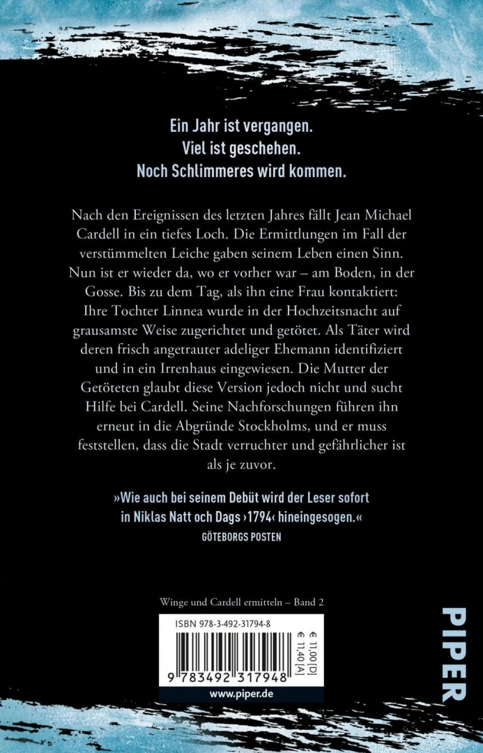 Ermittler Jean Michael Cardell ist am Ende seiner Kräfte. Er schafft es kaum, die Ereignisse des Vorjahres zu verarbeiten, da meldet sich eine Frau bei ihm. Ihre Tochter wurde grausam ermordet, der Ehemann als Täter identifiziert. Doch dieser Fall ist wesentlich verstrickter, als es den Anschein hat. Und so begibt sich Jean Michael Cardell gemeinsam mit dem hochintelligenten Bruder von Cecil Winge in die schmutzige Unterwelt des historischen Stockholms, in dem die Gosse gleich neben dem Glanz wartet.