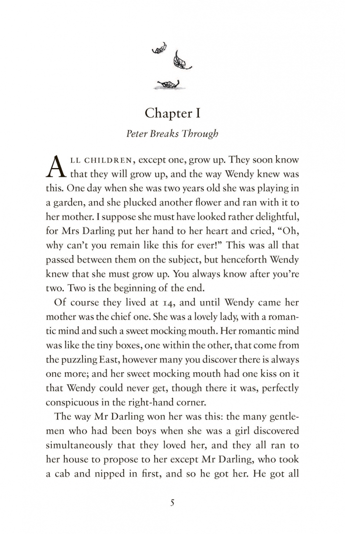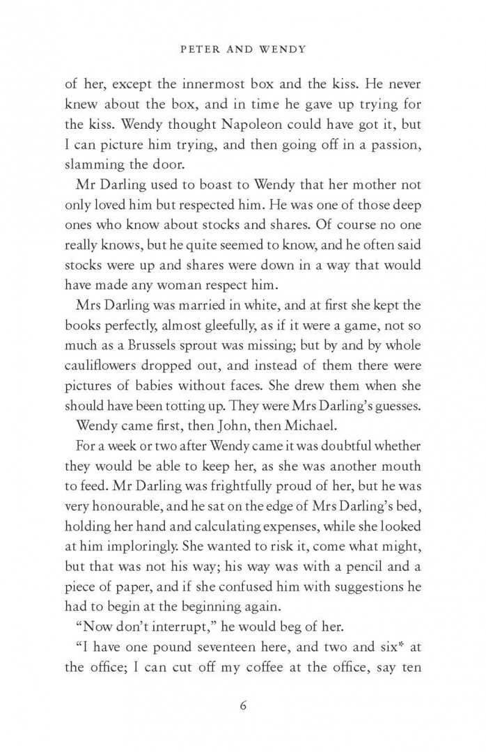 In addition to the famous 1911 novel Peter and Wendy, which tells the familiar adventures of Peter Pan in Neverland and popularized the characters of Tinkerbell and Captain Hook, this volume contains the celebrated stage version on which Peter and Wendy is based, as well as Peter Pan in Kensington Gardens, in which Peter Pan is a seven-day-old infant who consorts with birds and fairies and travels down the Serpentine in a thrush's nest.