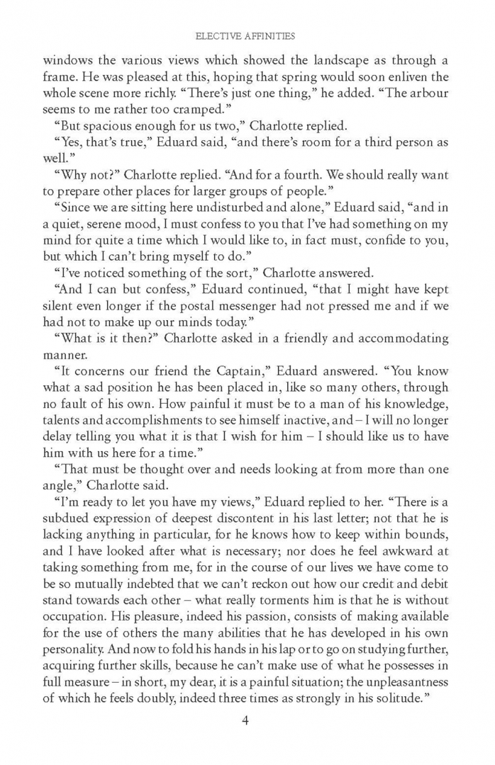 Baron Eduard and his second wife Charlotte enjoy a quiet, humdrum existence in their opulent castle, but when he invites his friend the Captain and she invites her niece Ottilie to stay with them, their lives are turned inside out as both hosts begin to feel attracted to their guests. Using one of the chemistry theories of the time as a metaphor throughout the novel, Goethe juxtaposes social interactions with scientific principles, while illustrating the typically Romantic concern of the individual coming to terms with society.
