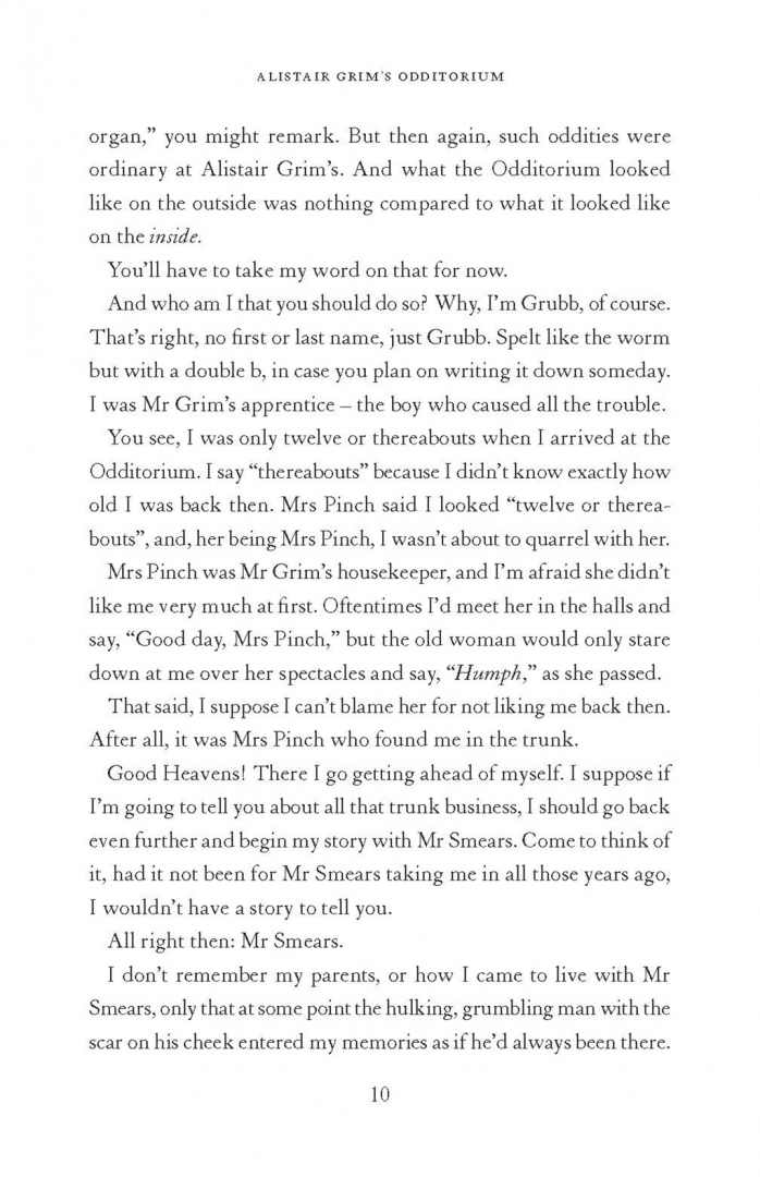 Twelve-year-old Grubb lives a hand-to-mouth existence in Victorian England, working as a chimney sweep under a cruel master. After an incident at an inn, he hides in the trunk of one of its guests, the enigmatic Alistair Grim, and is whisked away to his Odditorium, a wonderful flying house full of incredible mechanical features powered by an enigmatic substance called animus.