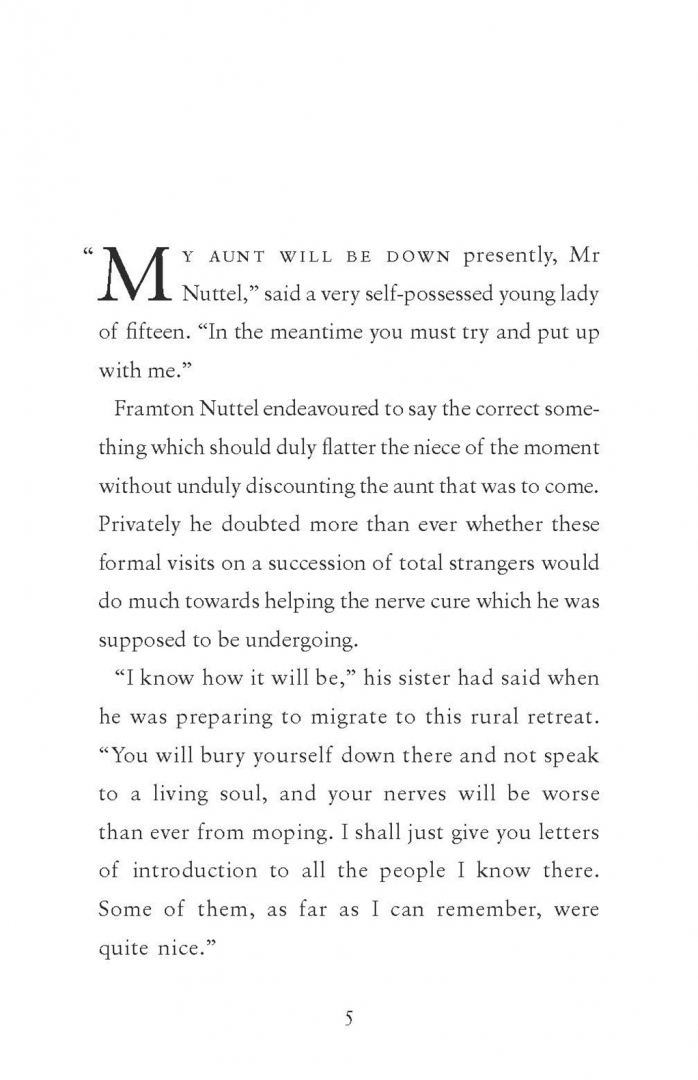 Contains: 'The Open Window', 'The Boar-Pig', 'The Chaplet', 'The Lumber Room', 'The Shartz-Metterklume Method', 'Gabriel-Ernest', 'Sredni Vashtar', 'The Storyteller', 'The She-Wolf'.