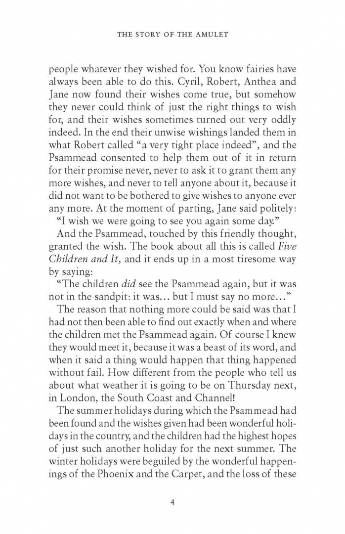 When Cyril, Anthea, Robert and Jane find the Psammead, a magical sand fairy, in a pet shop in London, they have no idea that they are about to embark on their greatest adventure yet. The Psammead leads them to an Egyptian amulet that has the power to grant whatever their hearts desire. The problem is that the amulet is broken, and the other half – needed if their wishes are to be granted – is lost. Yet with their half of the amulet able to transport them through time, the children set out on a search for the missing half, and the realization of their wildest dreams…