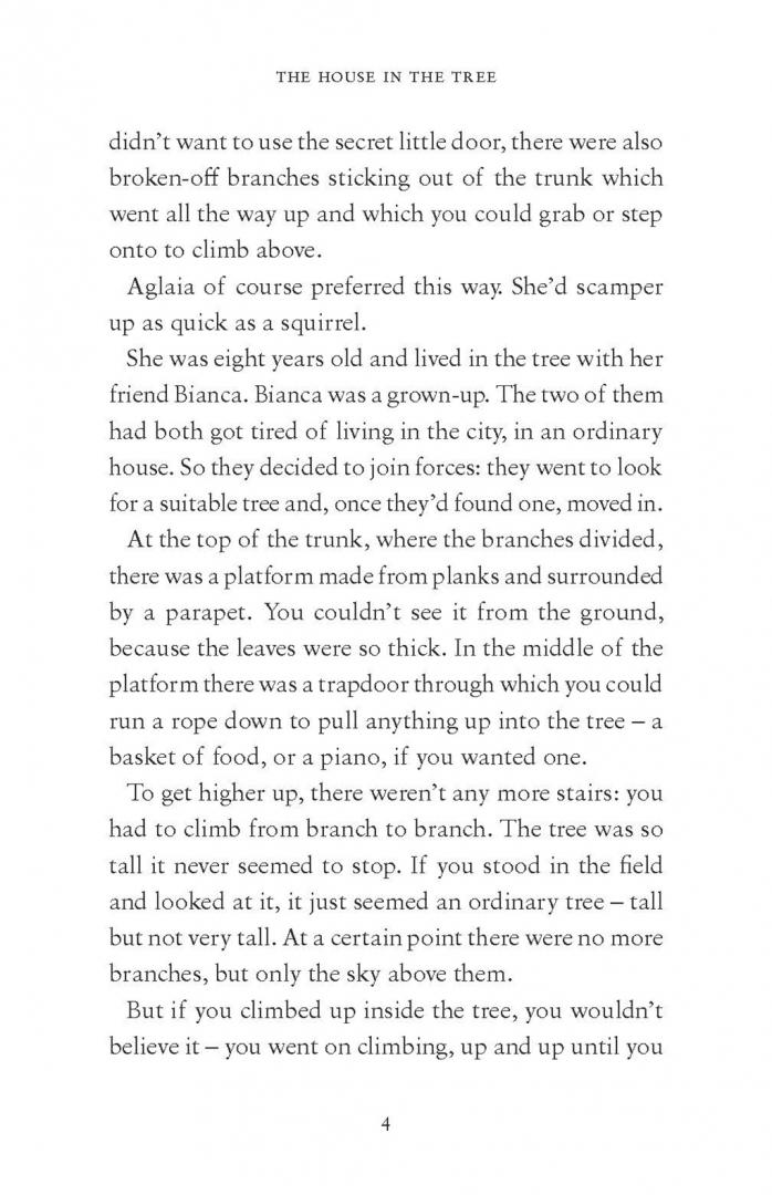 All children dream of having a secret house where they can live on their own, far from any rules and regulations. But not all of them are as lucky as Aglaia, who lives at the top of a magical tree together with her friend Bianca and an incredible host of flying dogs, talking cats, carnivorous flowers and children who speak in verse.