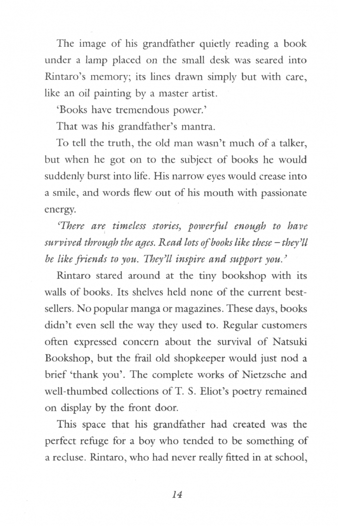 Natsuki Books was a tiny second-hand bookshop on the edge of town. Inside, towering shelves reached the ceiling, every one crammed full of wonderful books. Rintaro Natsuki loved this space that his grandfather had created. He spent many happy hours there, reading whatever he liked. It was the perfect refuge for a boy who tended to be something of a recluse.