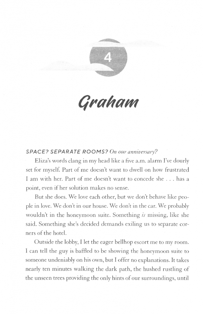 Eliza and Graham’s marriage is quietly failing. With their five-year anniversary approaching, neither of them are thrilled about the weeklong getaway they’ve been gifted. The luxury retreat prides itself on being a destination for those in love and those looking to find it - but for Eliza and Graham it’s the last place they want to be.