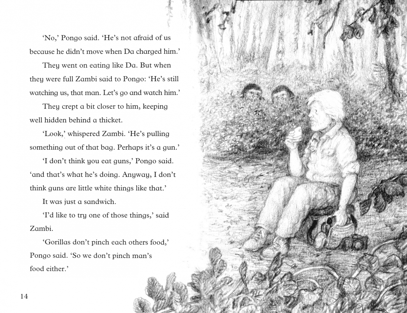 Pongo is a young gorilla who lives in the mountains of Africa. He has long glossy black hair and a black shiny nose. But Pongo can't wait to grow up, when he will have a silver back like his father's and a big chest that he can thump.
