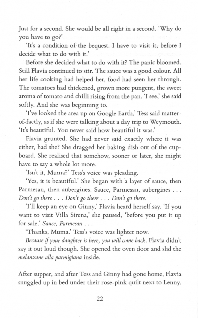 When Tess goes to Sicily, Flavia realises the secrets from her past are about to be revealed and decides to try to explain her actions. Meanwhile, Tess' teenage daughter Ginny is stressed by college, by her blooming sexuality and filled with questions that she longs to ask her father, if only she knew where he was...