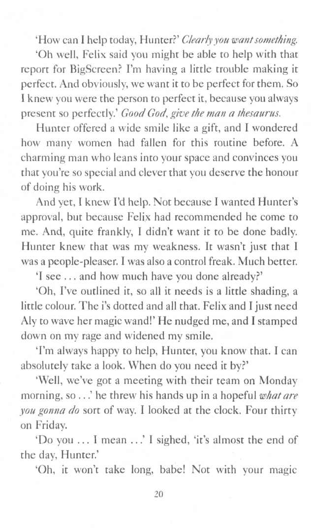 Ever since she can remember, Aly has tried fixing things: her parents' marriage, colleagues' work problems, and all her friends' love lives. But when she bumps into her ex - who has gone from a living in his parents' basement to a happily-married success - she realises she's been fixing her boyfriends, too . . .