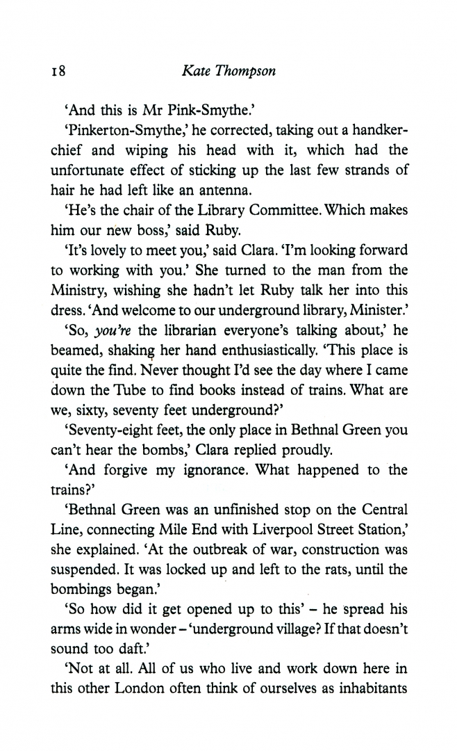 Clara Button is no ordinary librarian. While the world remains at war, in East London Clara has created the country's only underground library, built over the tracks in the disused Bethnal Green tube station. Down here a secret community thrives: with thousands of bunk beds, a nursery, a cafe and a theatre offering shelter, solace and escape from the bombs that fall above.