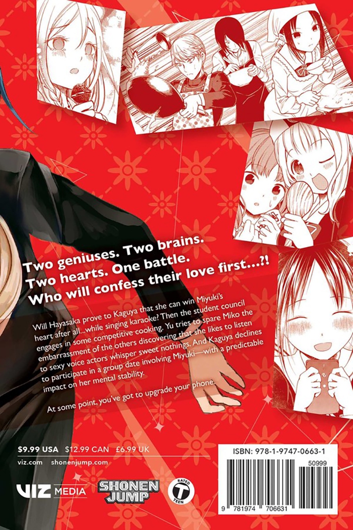 Will Ai prove to Kaguya that she can win Miyuki’s heart after all…while singing karaoke? Then the student council engages in some competitive cooking. Yu tries to spare Miko the embarrassment of the others discovering that she likes to listen to sexy voice actors whisper sweet nothings. And Kaguya declines to participate in a group date involving Miyuki—with a predictable impact on her mental stability.