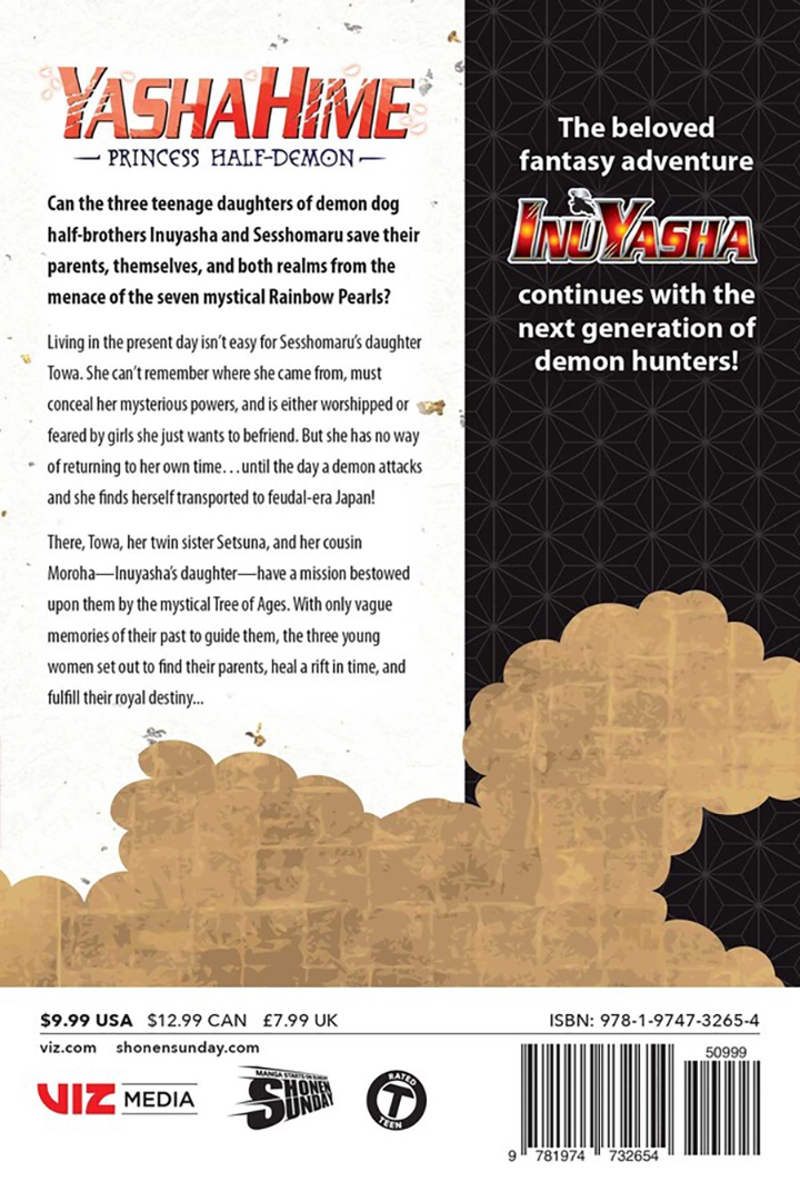 Living in the present day isn’t easy for Sesshomaru’s daughter Towa. She can’t remember where she came from, must conceal her mysterious powers, and is either worshipped or feared by girls she just wants to be friends with. But she has no way of returning to her own time until one day…a demon attacks and she is transported to feudal-era Japan.