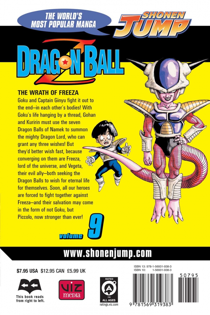 Goku and Captain Ginyu fight it out to the end - in each other's bodies! With Goku's life hanging by a thread, Gohan and Kuririn must use the seven Dragon Balls of Namek to summon the mighty Dragon Lord, who can grant any three wishes! But they'd better wish fast, because converging on them are Freeza, lord of the universe, and Vegeta, their evil ally - both seeking the Dragon Balls to wish for eternal life for themselves. Soon, all our heroes are forced to fight together against Freeza - and their salvation may come in the form of not Goku, but Piccolo, now stronger than ever!