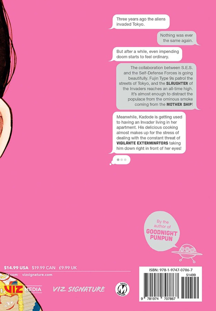 The collaboration between the S.E.S. and the Self-Defense Forces is going beautifully as Hujin Type 9s patrol the streets of Tokyo and the slaughter of the Invaders reaches an all-time high. It’s almost enough to distract the populace from the ominous smoke coming from the mother ship! Meanwhile, Kadode is getting used to having an Invader living in her apartment. His delicious cooking almost makes up for the constant threat of watching him get slaughtered in front of her eyes by vigilante exterminators!