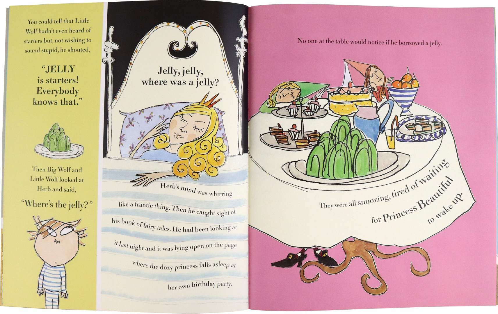 Every night, Herb’s mother reads him a bedtime story. Sometimes it’s about a big bad wolf who terrifies little girls and their grandmothers with his growl and his sharp teeth. The story gets very nasty in the middle and everybody nearly comes to a sticky end. But, by the last page, it all turns out happily-ever-afterly.