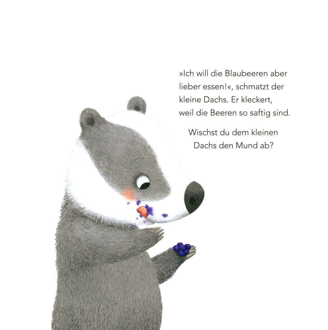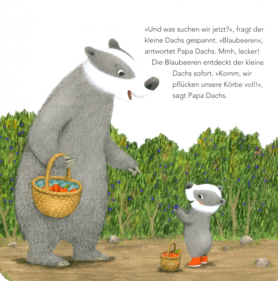 Der kleine Dachs will alles alleine machen und alles selbst entscheiden. Beim Vorrätesammeln im Wald will er den großen Apfel selber tragen, ganz viele Blaubeeren essen und mit dem Haselnüssen spielen. Aber als der kleine Dachs zu tief in den Wald hineinläuft, muss Papa auch mal streng sein. Das gefällt dem kleinen Dachs gar nicht und als er dann auch noch müde wird, will er keinen Schritt mehr machen und sein Körbchen nicht tragen. Da hilft nur noch Papas Arm!