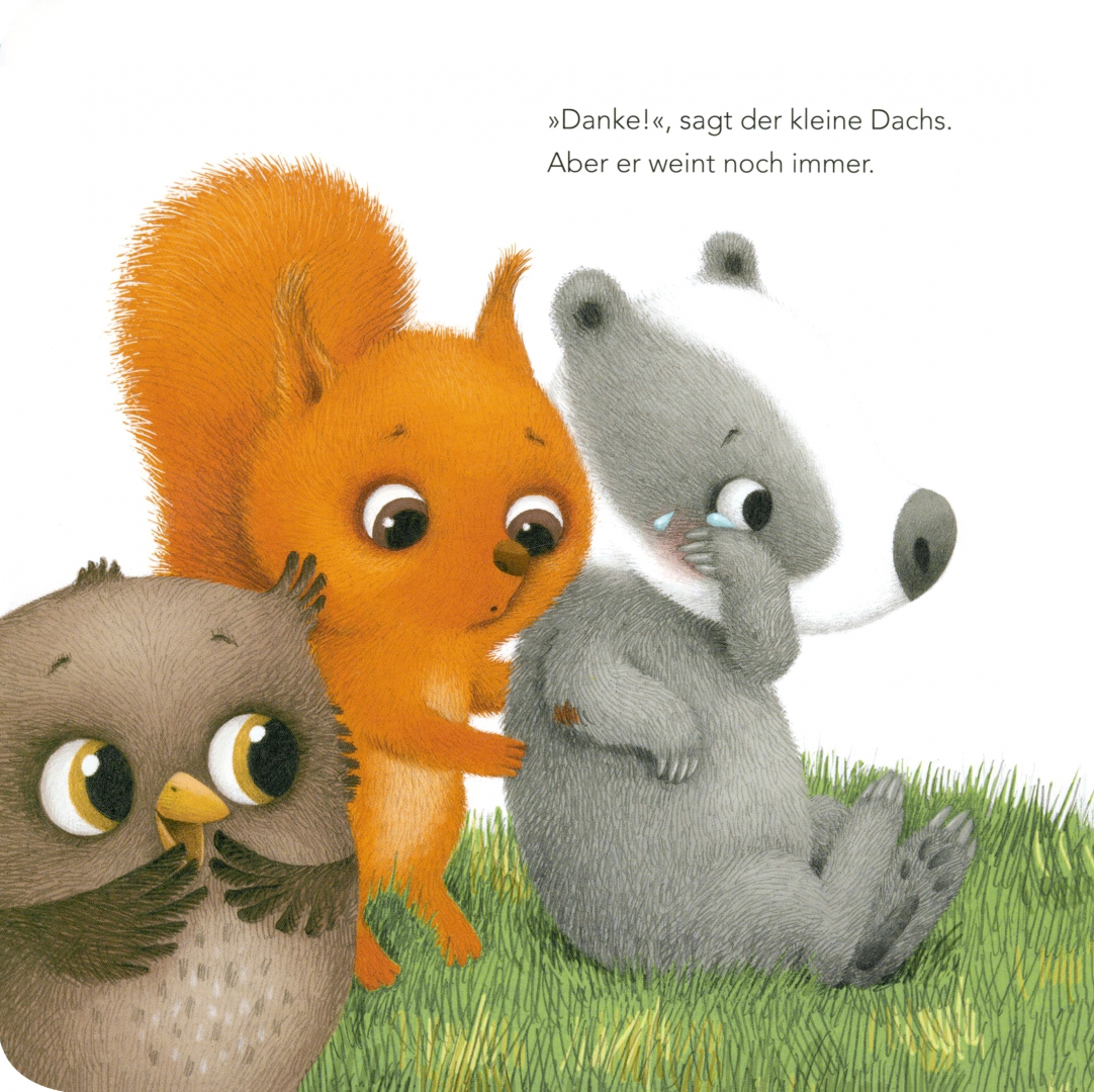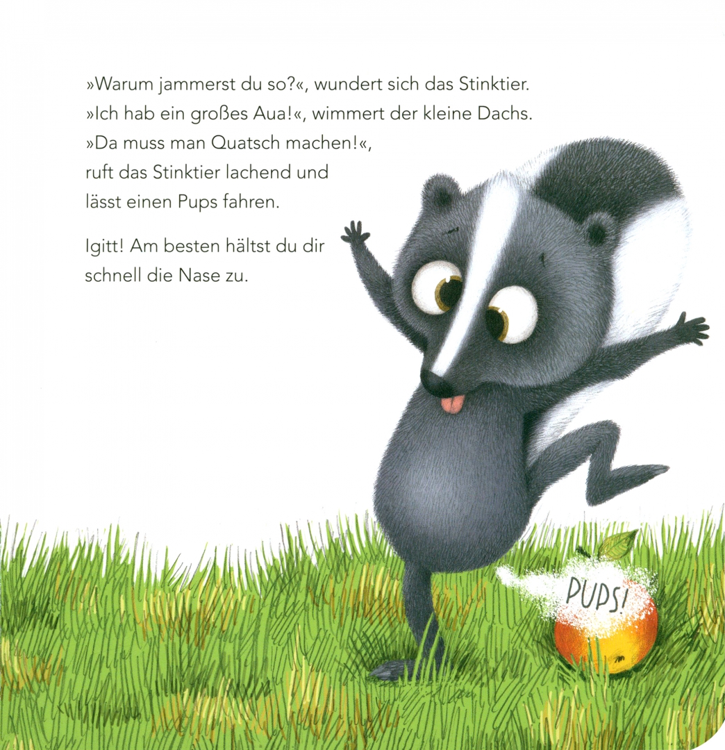Plumps, da sitzt der klein Dachs im Gras. Nur ein kleiner Kratzer, aber der Schreck ist groß. Schnell sind seine Freunde zur Stelle. Die kleine Eule streichelt den kleinen Dachs sanft, das Eichhörnchen pustet kräftig und das Stinktier macht wie immer Quatsch. Endlich kommt Papa Dachs mit einem Pflaster und nimmt ihn in den Arm. Alles wieder gut!