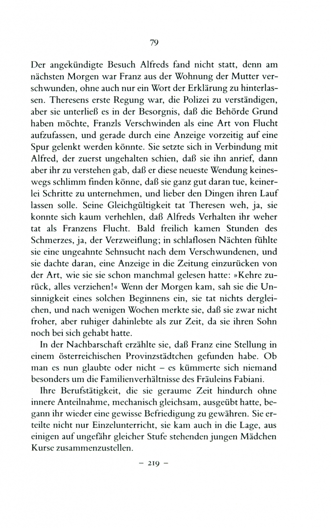 Therese Fabiani ist »eine Gestalt, die von den Lesern ständige Hellhörigkeit und Aufmerksamkeit fordert«. (Ruth Klüger) Tochter eines Offiziers, der geisteskrank stirbt, und einer Mutter, die sie schon früh an einen Adligen verkuppeln will, behält sie das Gefühl, im letzten immer allein zu sein. Ihr Leben ist zum Scheitern bestimmt. Arthur Schnitzler gibt ihr jedoch als einziger der wenig charaktervollen Figuren eine Entwicklung ins Positive. Dieser Roman spiegelt die Situation des Vorkriegsösterreich, das »eine Vergangenheit hat, aber keine Zukunft«.