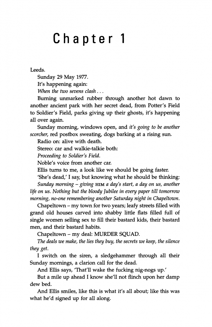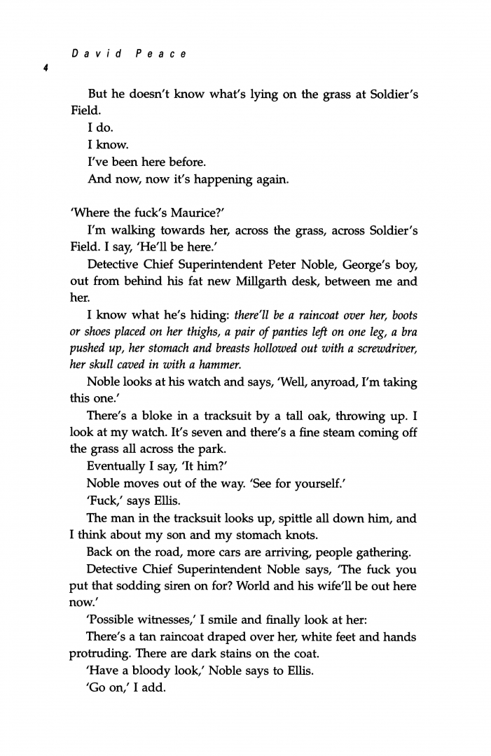 And as the summer moves remorselessly towards the bonfires of Jubilee Night, the killings accelerate and it seems as if Fraser and Whitehead are the only men who suspect or care that there may be more than one killer at large. Out of the horror of true crime, David Peace has fashioned a work of terrible beauty. Like James Ellroy before him, David Peace tells us the true and fearsome secret history of our times.