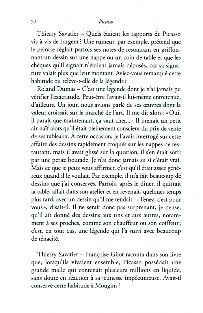 Pour la première fois, l’historien de l’art Thierry Savatier a eu accès à toutes les archives de Roland Dumas concernant Picasso. Au cours de leurs entretiens, les deux auteurs abordent l’artiste à travers plusieurs thèmes, incluant le travail de l’artiste, l’histoire de Guernica, la création foisonnante des dernières années. Ces dialogues dévoilent aussi des aspects moins connus, comme le rapport de Picasso avec les maîtres du passé et ses contemporains, ses opinions politiques, la place souvent controversée que tint auprès de lui sa dernière femme Jacqueline, les procès dans lesquels il fut partie prenante ou les épisodes tumultueux de sa succession. De ces échanges entre un historien et un grand témoin, émerge le profil parfois inattendu du tout dernier Picasso.