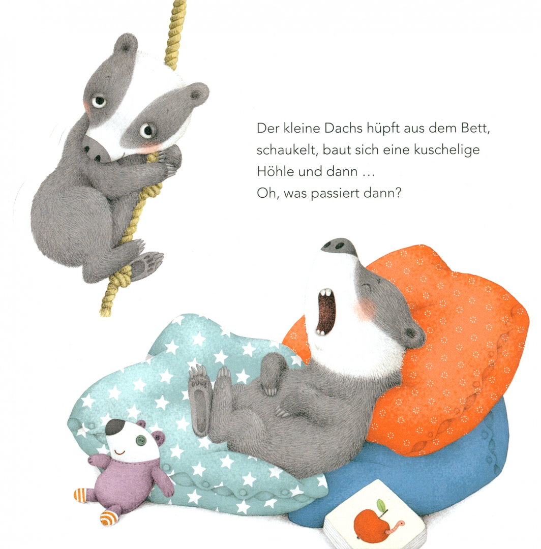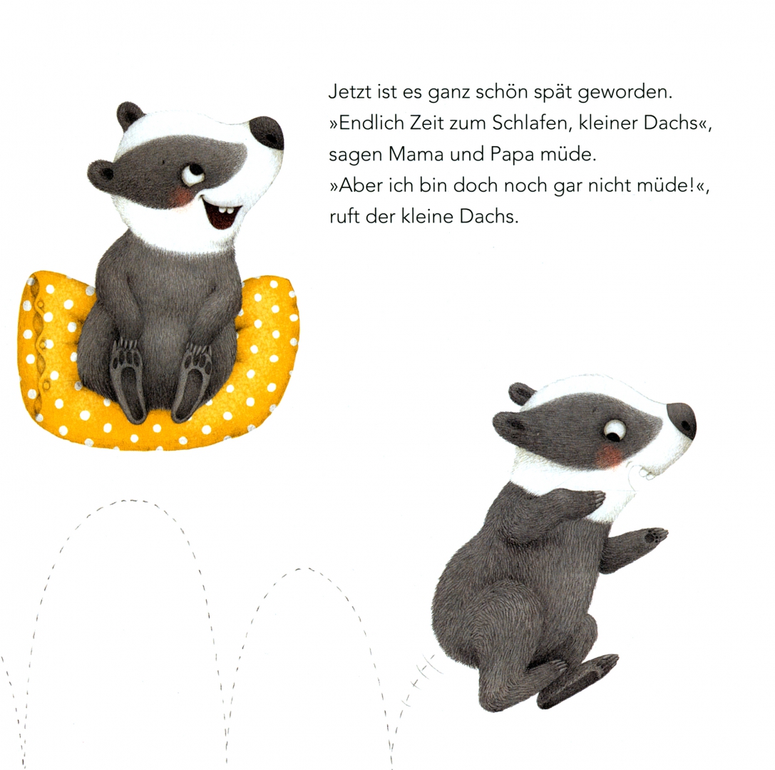 Der kleine Dachs ist viel zu müde. Zu müde zum Aufräumen. Zu müde zum Essen. Zu müde zum Zähneputzen. Aber als er dann tatsächlich ins Bett gehen soll, ist die Müdigkeit wie weggeblasen. „Ich bin noch gaaar nicht müde“, tönt der kleine Dachs. Was nun?