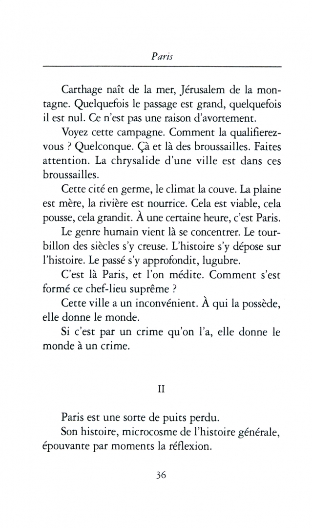 "Paris est un semeur. Où sème-t-il ? dans les ténèbres. Que sème-t-il ? des étincelles. Tout ce qui, dans les intelligences éparses sur cette terre, prend feu ça et là, et pétille, est le fait de Paris. Le magnifique incendie du progrès, c'est Paris qui l'attise. Il y travaille sans relâche. Il y jette ce combustible, les superstitions, les fanatismes, les haines, les sottises, les préjugés. Toute cette nuit fait de la flamme, et grâce à Paris, chauffeur du bûcher sublime, monte et et se dilate en clarté.